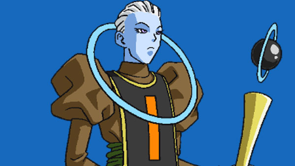 Il porte bien sûr une auréole bleue autour du cou, comme les autres anges assistant les dieux de la destruction. Et porte aussi un sceptre, qui l’aide à accomplir ses tâches de guide de l’Univers 8.