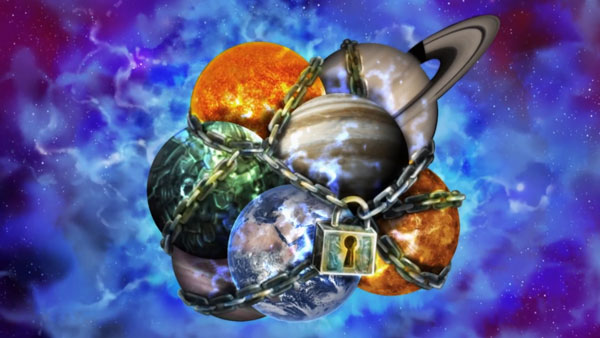 Il s’agit d’un amalgame de planètes, attachées les unes aux autres et retenues par d’immenses chaines.