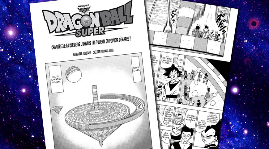 Il n’y a pas de couverture pour ce chapitre. La première page affiche donc le logo du manga Dragon Ball Super, le titre du chapitre en question et la première case qui dévoile l’arène du Tournoi du Pouvoir.